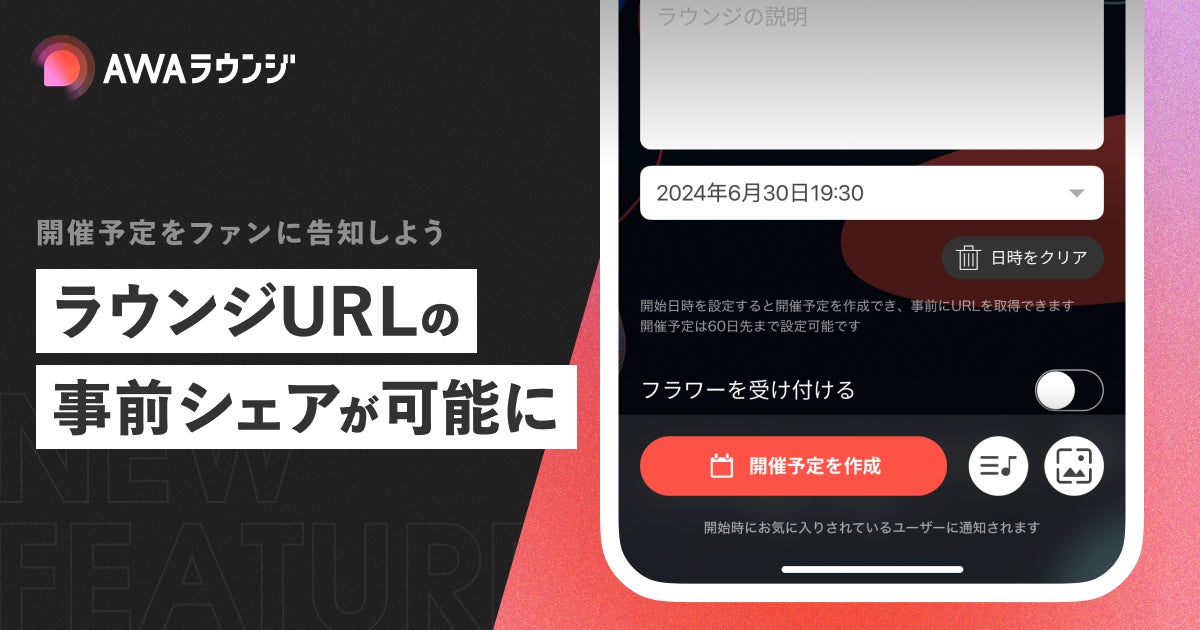 AWA株式会社(本社:東京都港区、代表取締役CEO:冨樫晃己)が運営する、サブスクリプション型(定額制)音楽ストリーミングサービス「AWA(アワ)」は、4月22日にユーザー同士がリアルタイムに、同じ空間で同じ音楽を楽しみながら、音声配信やチャットができるオンライン空間「LOUNGE(ラウンジ)」にて、ラウンジの開催予定が作成できる機能を追加いたしました。