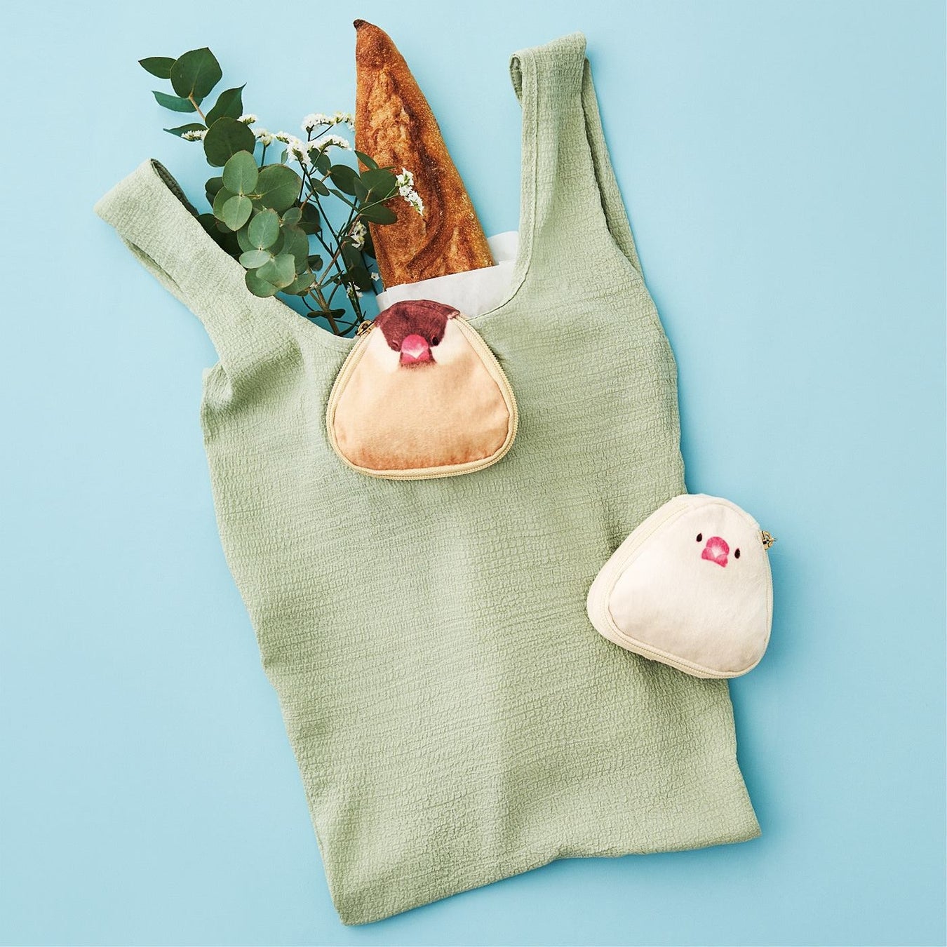 バッグにぶらさげて持ち歩けるマスコットのようなおもち文鳥の中に入ったエコバッグです。