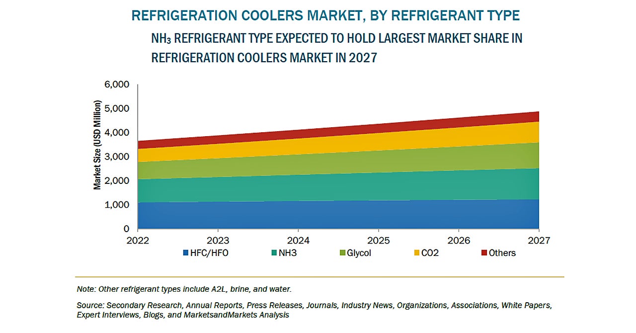 冷凍クーラーの市場規模は、2022年の36億米ドルからCAGR 6.0%で成長し、2027年には48億米ドルに達すると予測されています。冷蔵倉庫/冷蔵貯蔵庫への投資の増加、冷凍・加工食品の需要増加、革新的でコンパクトな冷凍クーラーの需要増加、商業・産業用途での自然冷媒ベースのシステムの採用などが、同市場の需要を押し上げると考えられます。