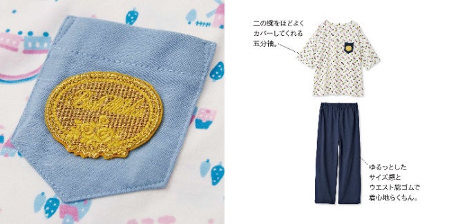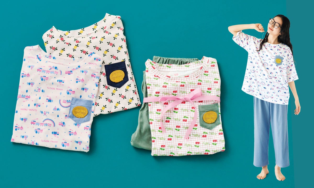 薄手のカットソー生地で肌心地のよいルームウェアです。包装紙柄のトップスと無地のボトムスの組み合わせで、大人も楽しめるデザインに仕上がっています。モチーフとなった包装紙柄は、〈3色小花〉〈シモジマトレイン〉〈チェリー〉の3種類です。