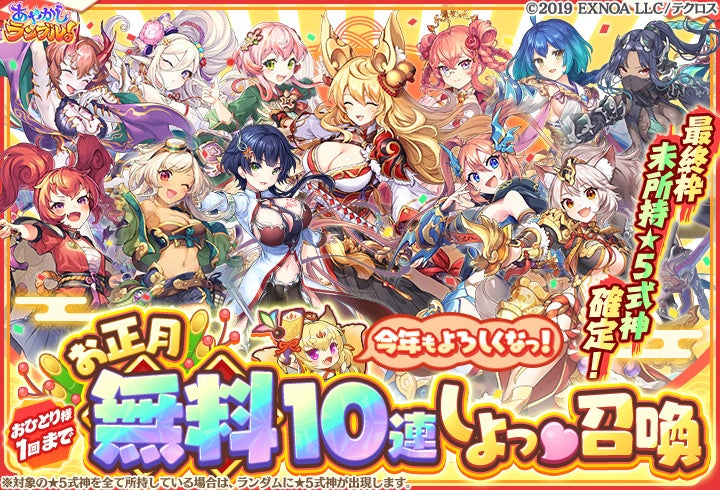 あやかし美少女RPG!DMM GAMES『あやかしランブル!』にて、未所持★5式神確定の無料10連召喚を開催!さらに新守護五天「★5ヒメノ」やお正月限定式神も登場!