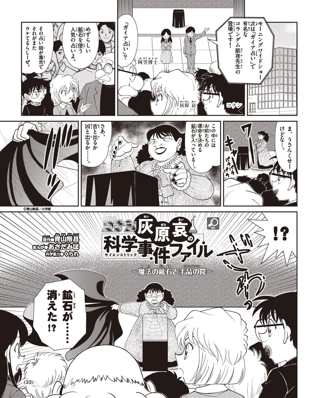 テレビ局の収録で、有名な占い師による占いのステージを見ていた哀とコナンたち。めずらしい鉱石を使う「コランダム占い」だという。ところが、占いの最中に鉱石がすっかり消えてしまう!哀たちは科学の知識を生かしてナゾを解いていく!