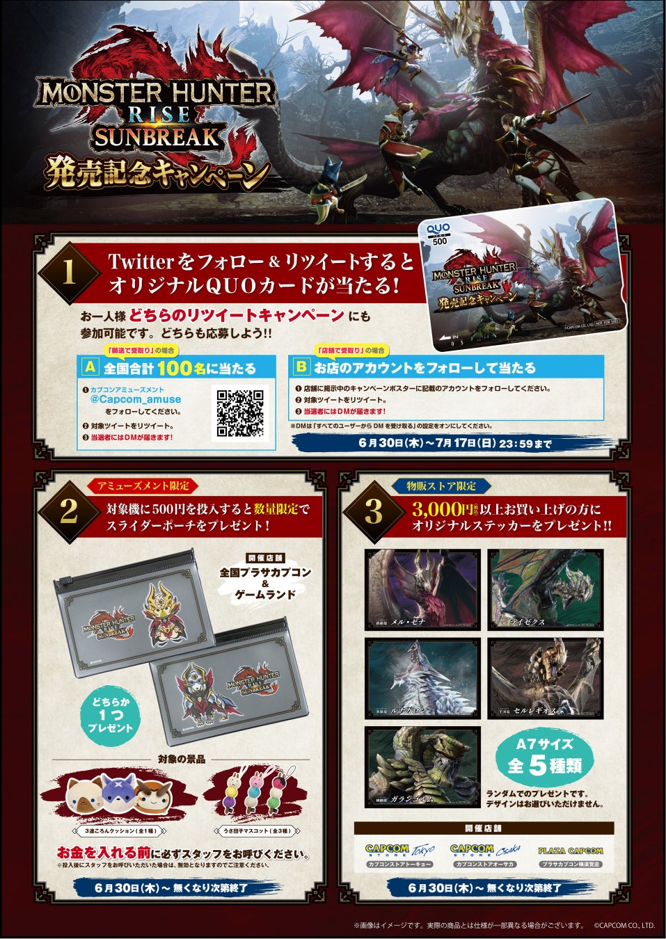 A):期間中、「カプコンアミューズメントTwitterアカウント」(@Capcom_amuse)をフォローし、対象のツイートをRTされた方の中から抽選で、100名様に『モンスターハンターライズ:サンブレイク』デザインのオリジナルQUOカードをプレゼントいたします。