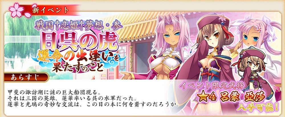 DMM GAMES『戦国†恋姫オンライン ~奥宴新史~』にて恋姫†夢想シリーズとのコラボイベント『戦国†恋姫†夢想・参 日呉の虎、運命の出逢いを果たすのこと』を開催!