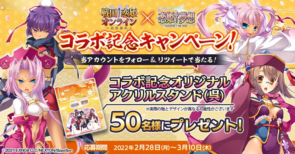 本日2月28日(月)より、『戦国†恋姫オンライン ~奥宴新史~』にて『戦国†恋姫†夢想コラボ・参イベント』を開催いたします!