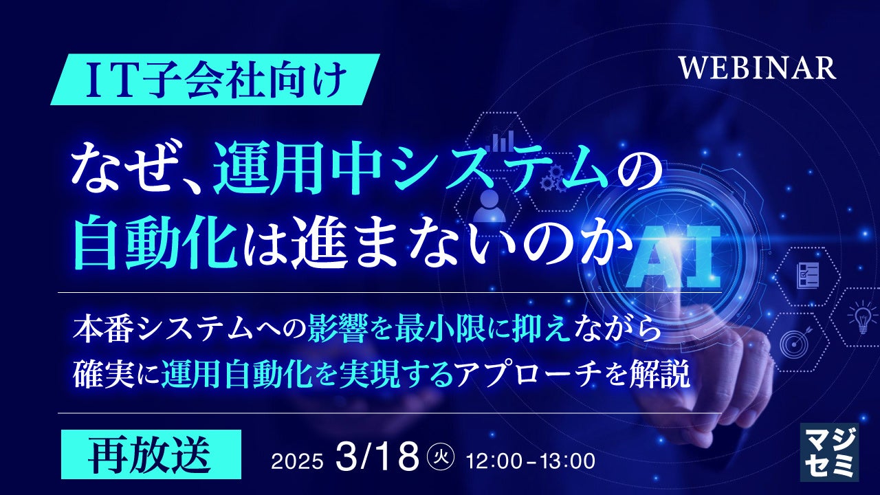 マジセミ株式会社は、大変好評をいただいた「【再放送】【IT子会社向け】なぜ、運用中システムの自動化は進まないのか」というテーマのウェビナーを再放送します。