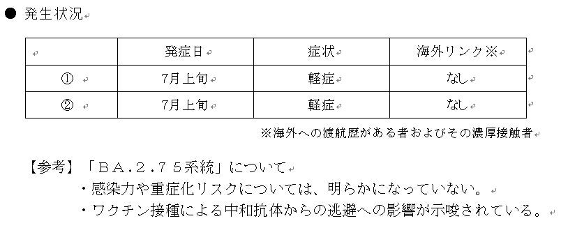 この度、ゲノム解析の結果、新たに、オミクロン株の亜系統である「BA.2.75系統」を2例確認したため、下記のとおり、お知らせいたします。