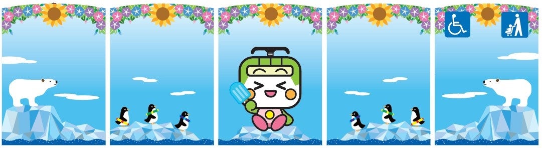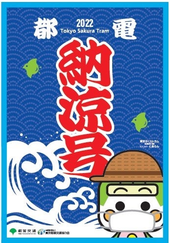 「都電納涼号」は、9002号車(青いレトロ車両)の車内や窓に夏らしく涼しげなデザインの装飾を施すとともに、車両前面にヘッドマークを装着し、車内及び沿線に涼をお届けいたします。