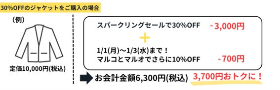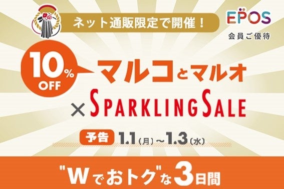 さらに『お正月 マルコとマルオの3日間』の期間中は、半期に1度の『スパークリングセール』が同時開催中!そのため、セール対象アイテムが、さらに10%OFFでお買い物いただけますので、大変おトクな期間です。『お正月 マルコとマルオの3日間』と『スパークリングセール』が同時開催中の貴重なこの機会をお見逃しなく!