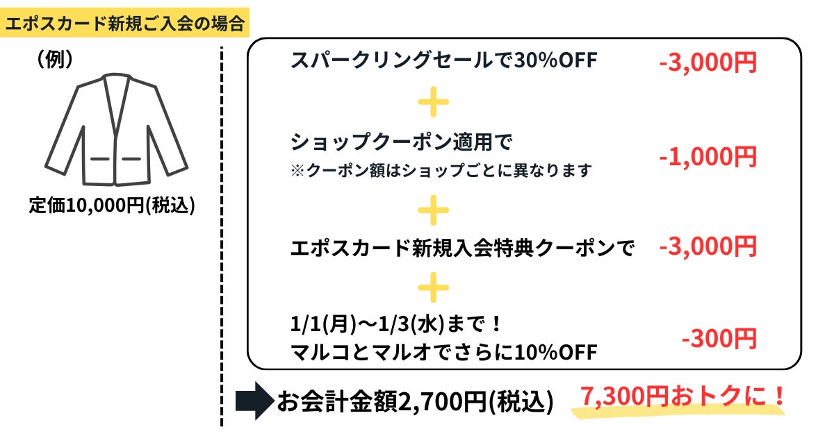 エポスカードをお持ちでないお客さまは、当日の新規ご入会でも10%OFFでお買い物いただけますが、12月22日(金)~1月3日(水)の期間にご入会いただくと、お買い物がさらにおトクになります。新規ご入会いただいた方には、入会特典としてwebクーポンをプレゼントしております。12月22日(金)~1月3日(水)までは、通常2,000円分のご入会特典webクーポンが合計5,000円分に!