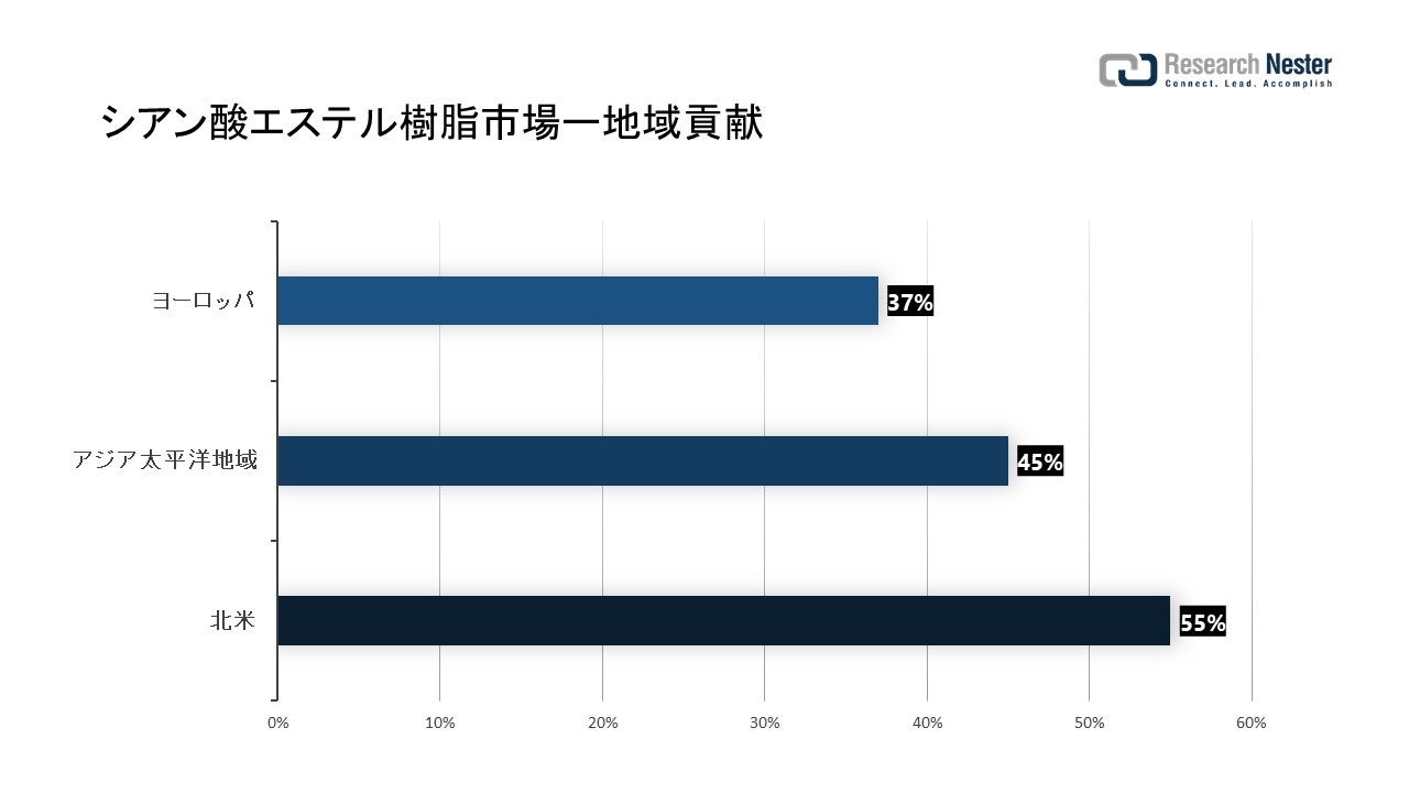 北米のシアン酸エステル樹脂市場シェアは、他のすべての地域の市場の中で、化学産業の開花により、2035 年末までに約 35% のシェアで最大になると予測されています。化学産業の成長は、今後数年間でシアン酸エステル樹脂の生産率が増加することを示す前向きな指標です。最近のレポートによると、化学産業は 2019 年に米国地域で約 5,500 億米ドルの収益を上げました。さらに、車両に対する高い需要がこの地域の自動車部門を拡大しています。シアン酸エステル地域は、自動車メーカーが軽量で耐久性があり、効率的な自動車を生産するための好ましい選択肢であるため、これは今後数年間で有利な機会をもたらすと予想されます。