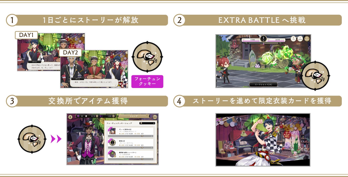 ※フォーチュンクッキーストーリーは、12月31日は16:00~23:59、1月1日以降は0:00~23:59の間にイベントトップ画面にアクセスすることで、自動的に再生されます。