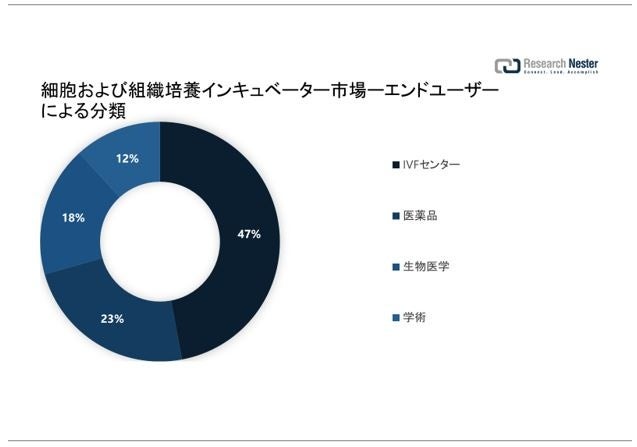 細胞および組織培養インキュベーター市場は、医薬品、生物医学、学術、IVFセンターへのエンドユーザーによる需要と供給についてセグメント化および分析されています。細胞および組織培養インキュベーターの 4 つのエンドユーザーのうち、IVF センター セグメントは、2035 年に最大の市場シェアを獲得すると推定されています。セグメントの成長は、実施される体外受精治療の頻度の増加に起因する可能性があります。 プレミアム細胞培養インキュベーターの需要は、体外受精治療の数とともに増加しています。統計によると、世界中で年間約 2百万件の体外受精が行われています。