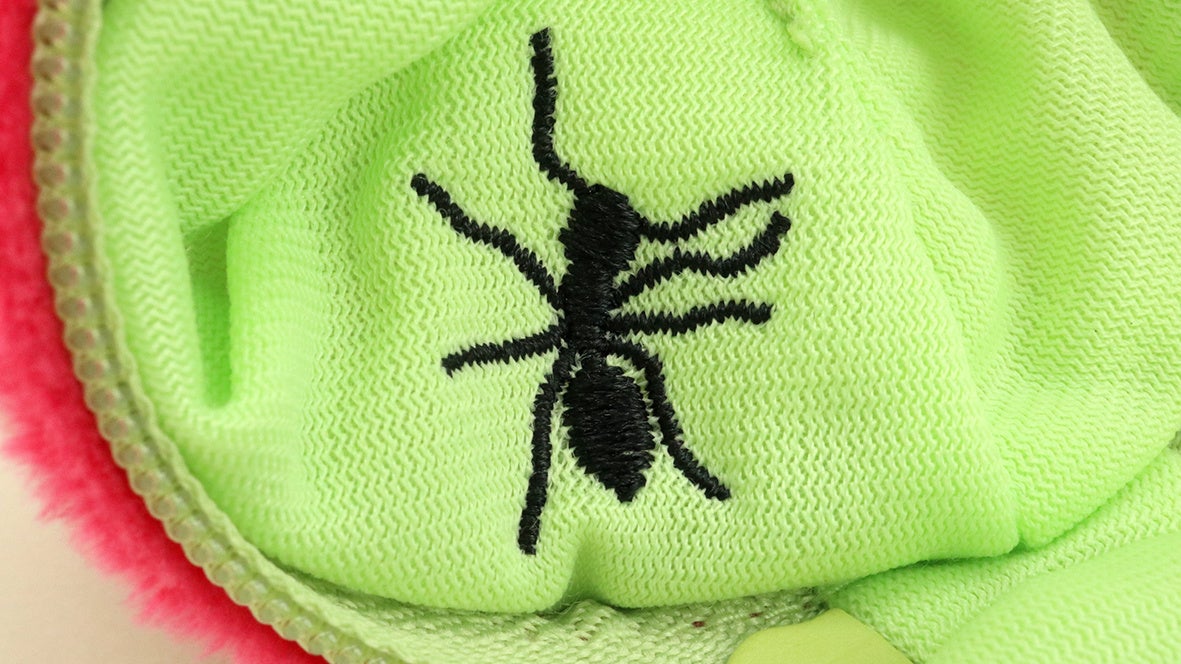 ファスナーをあけた内側にハエの刺しゅう入り!感触毛も再現しています。
