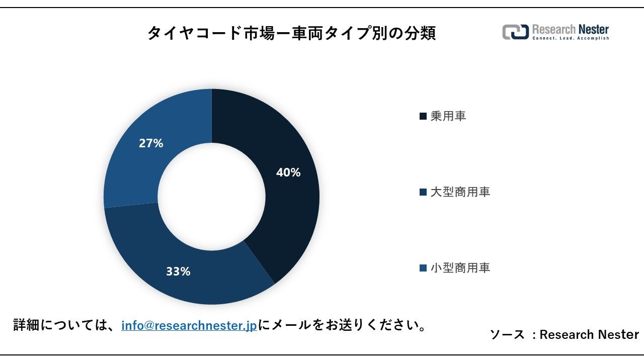 製品別に基づいて、ポリエステルセグメントは 2035 年には約 30% 程度の大きなシェアを獲得すると予想されています。このセグメントの成長は費用対効果のおかげであると考えられます。ポリエステルは、ナイロンやスチールなどの他のタイヤコード市場の材料に代わるコスト効率の高い代替品です。高い引張強度と耐摩耗性を備えながら、製造コストが安価です。その結果、タイヤコード業界、特に乗用車のタイヤなどの大量生産用途に広く使用されています。自動車産業は、特に乗用車用タイヤのポリエステル タイヤ コード製品の主要消費者です。自動車産業、特に中国やインドなどの新興タイヤコード市場における成長により、ポリエステルタイヤコード製品の需要が高まることが予想されます。ポリエステルタイヤコード製品はリサイクル可能で、他の用途に再利用できるため、スチールなどの他のタイヤコード材料に代わる環境に優しい代替品となります。