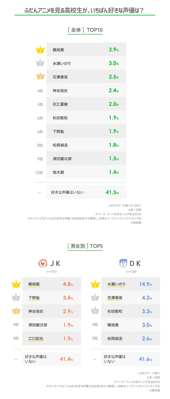 男女別にみると、男子高生では女性声優の「水瀬いのり」「花澤香菜」がTOP2。