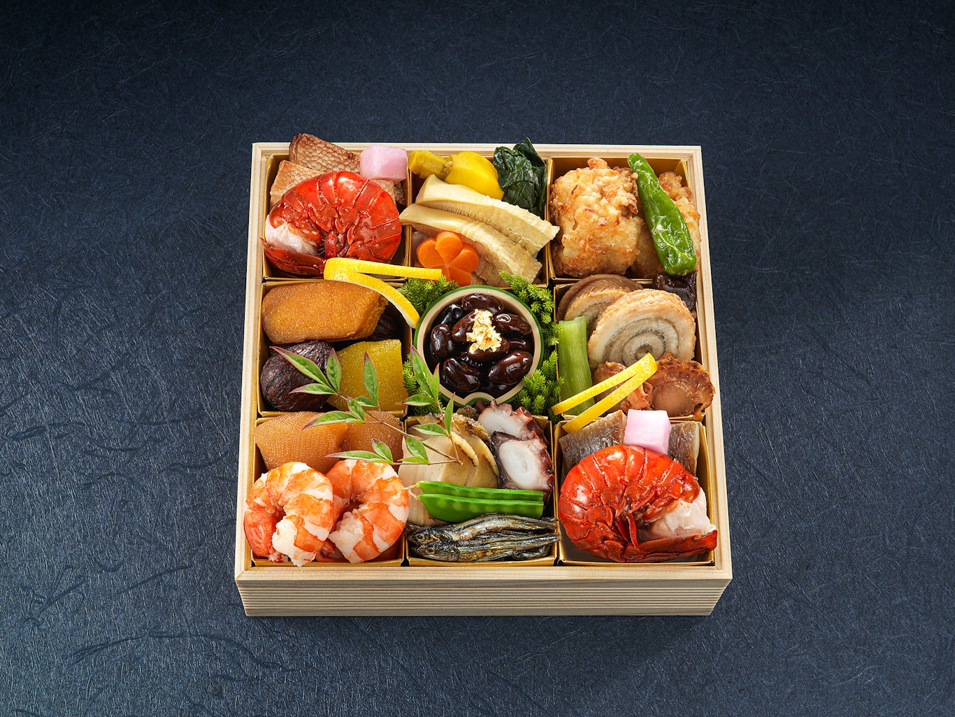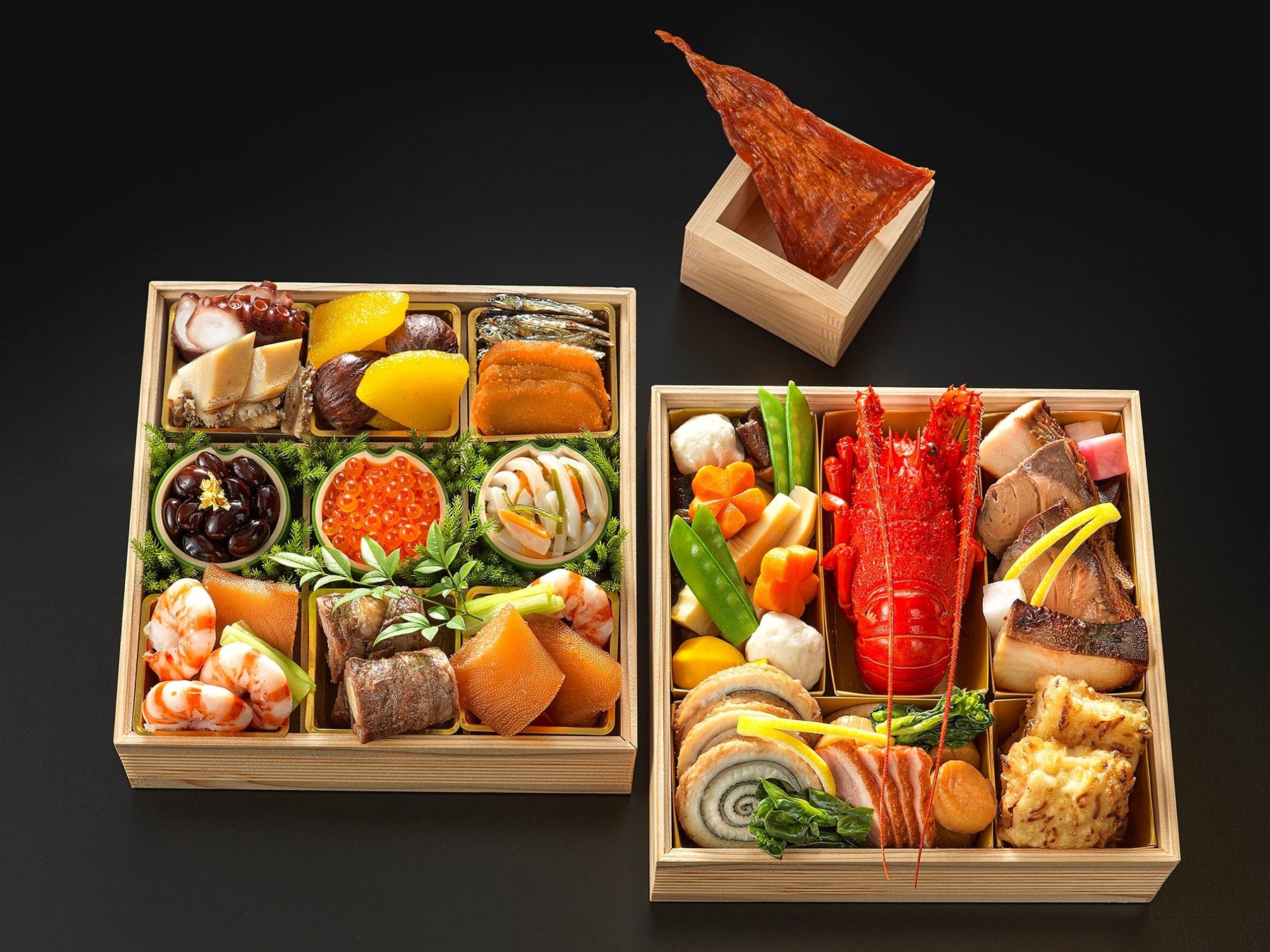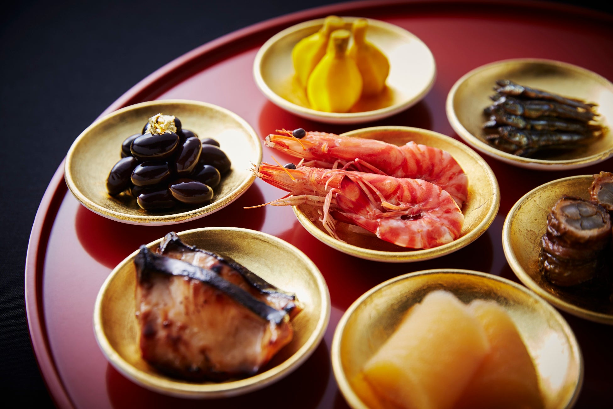 一段重の「夢おせち」は、黒豆、数の子、田作りの祝い肴三種に、鰤の味噌柚庵焼、まながつおの西京焼き、海老や鮑の煮物など、日本料理の技で丁寧に仕上げた選りすぐりの素材を美しく盛りつけました。美味しいものを少しずつ楽しみたい方やご来客のおもてなしとしてもお喜びいただける祝い膳です。
