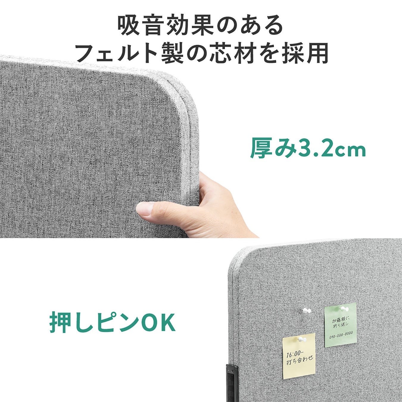本製品は、吸音効果のあるフェルトを使用した吸音パネルです。左右には連結用の面ファスナーを利用し、簡単に組立ができます。フェルト製のため、押しピンを使用することもできます。