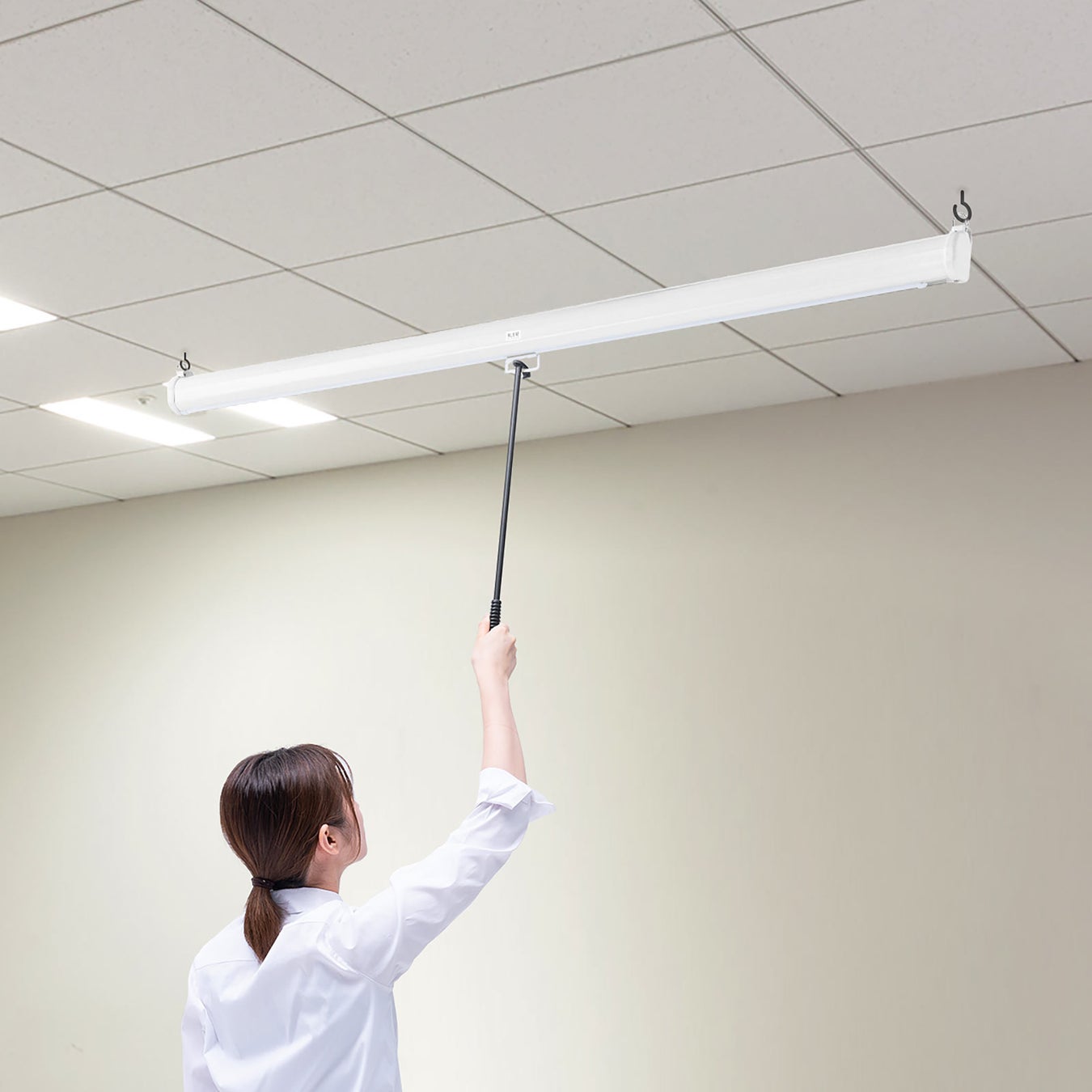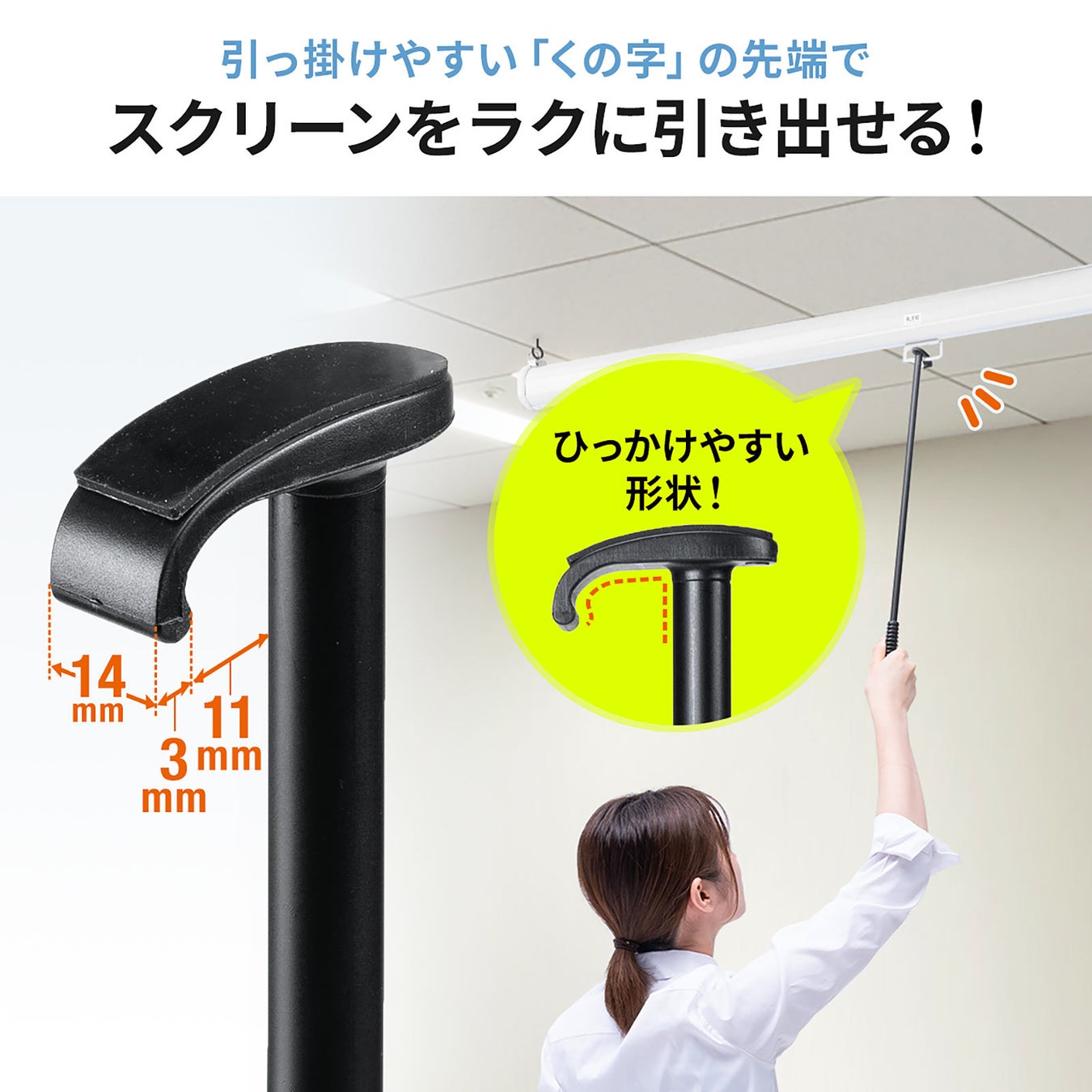 本製品は、吊り下げ式プロジェクタースクリーンを引き出すときに使用できるスクリーン用フック棒です。