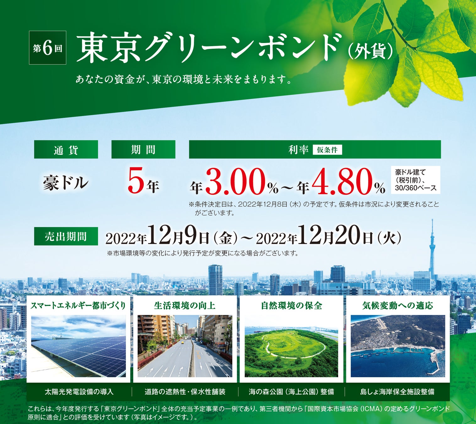 個人向け都債として発行する「東京グリーンボンド(外貨)」の仮条件を、下記のとおり決定しましたので、お知らせします。
