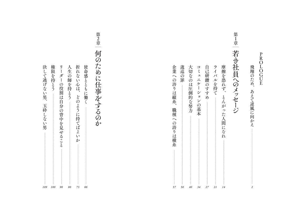 そのほかにも、「摩擦を恐れず、とんがった人間になれ」「起業への誇りは縦糸、職種への誇りは横糸」など、読者が勇気づけられる激励の言葉が満載です。それらは若い世代はもちろんのこと、ベテラン世代に至るまで、すべてのビジネスパーソンがこれからの厳しい社会を生き抜く指針となることでしょう。