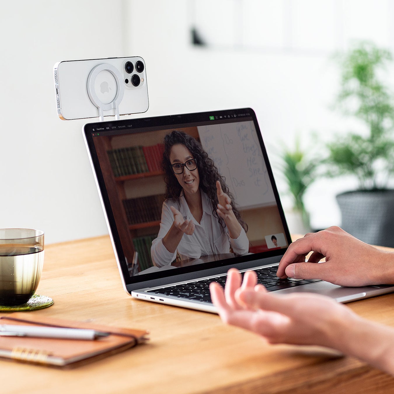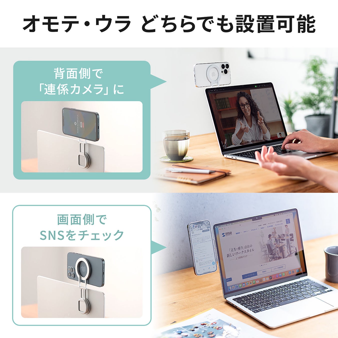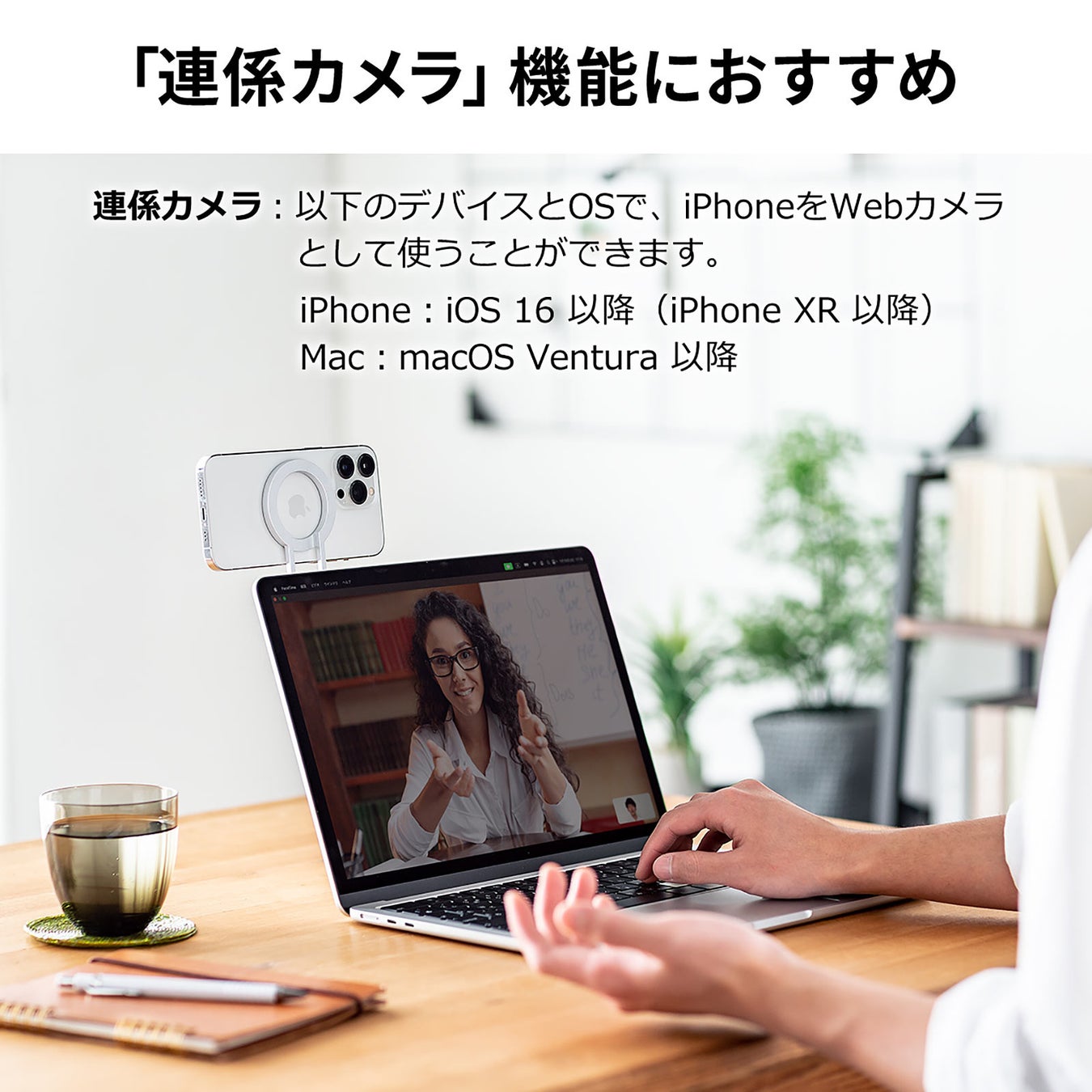 MagSafe対応iPhoneをホルダーに磁力でピタッと固定して連係カメラ機能を使えます。