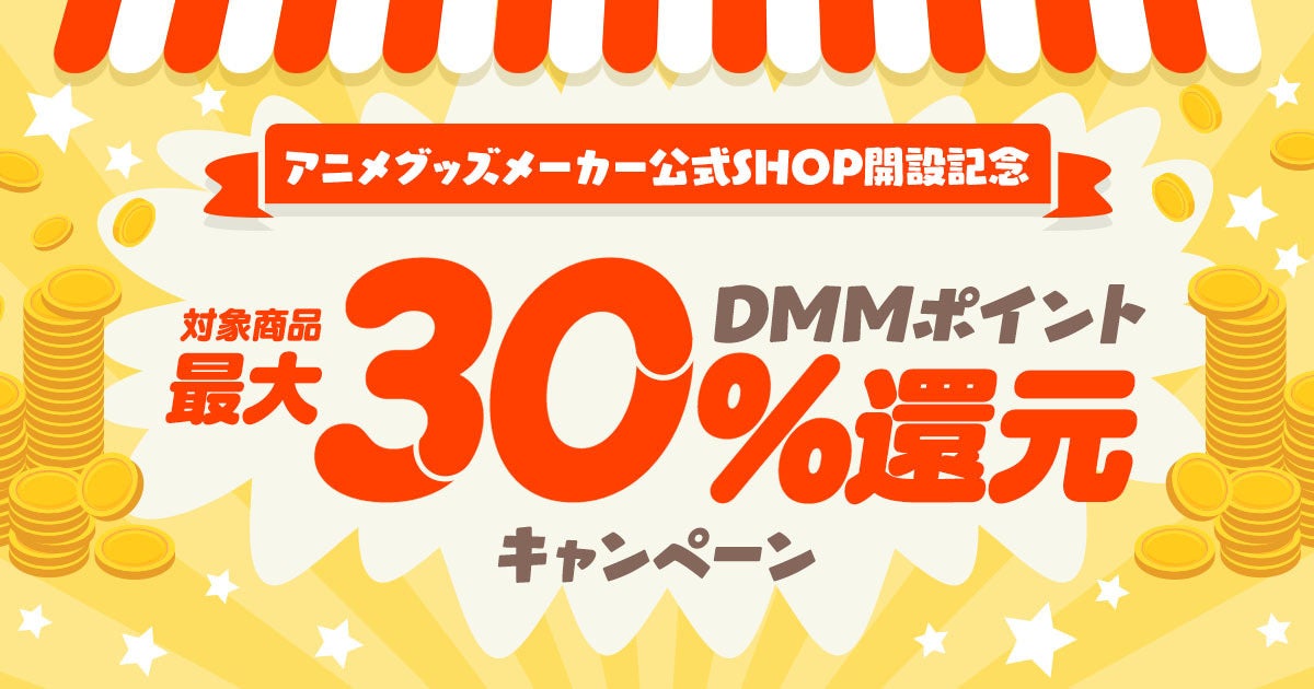 この度は、アニメグッズをさらに強化するため、「DMM通販」内に人気アニメグッズのメーカー公式ショップを開設いたしました。これを記念して対象商品が最大30%ポイント還元となるキャンペーンを実施いたします。お得な機会をぜひお見逃しなく。