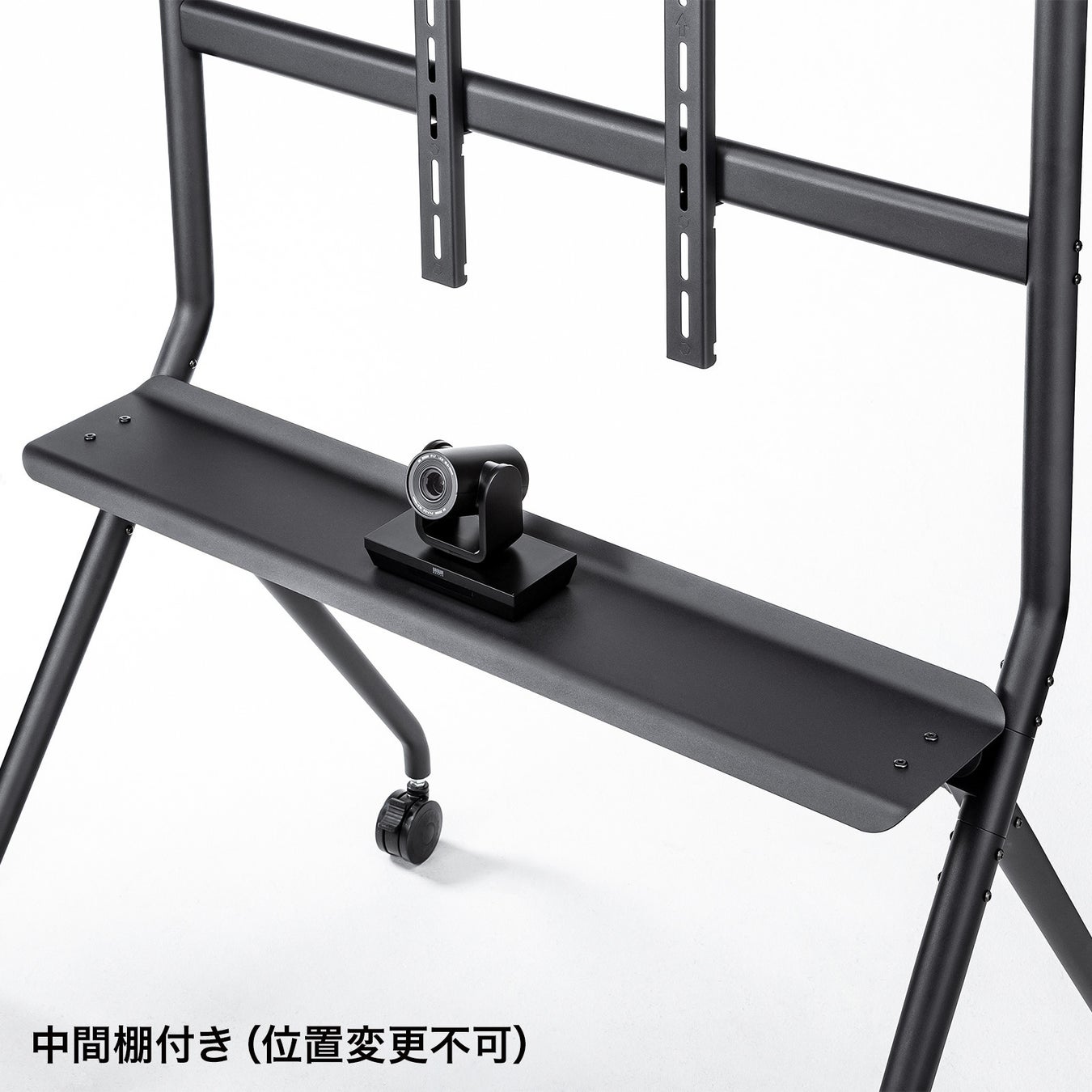 Webカメラやペンなど設置できる中棚がついており、テレビ会議や電子黒板を使用する際に便利です。ブラケットのフックの位置を変更することで高さを2段階変更することが可能なため、環境に応じて使いやすい高さに調節できます。