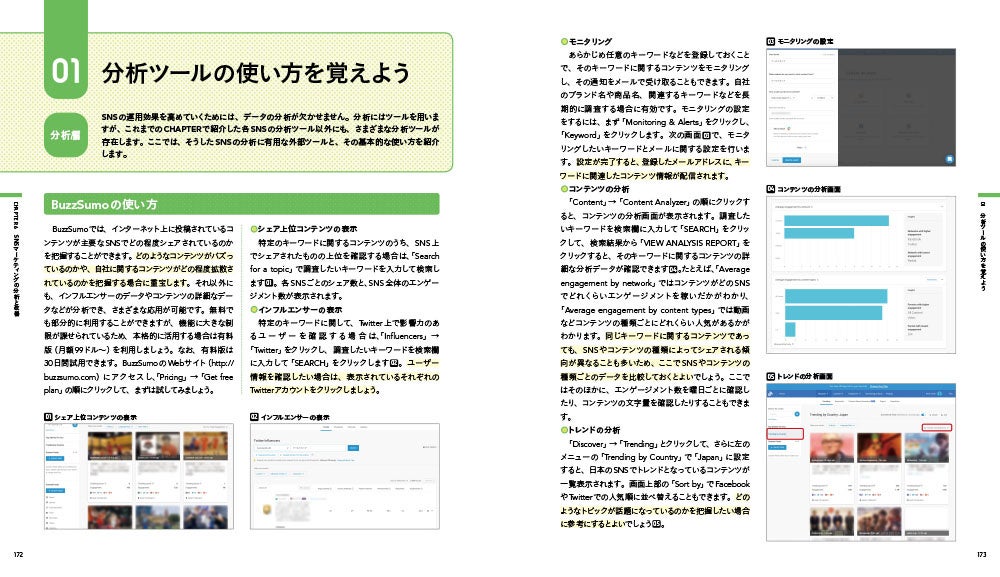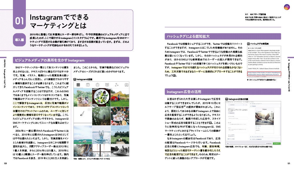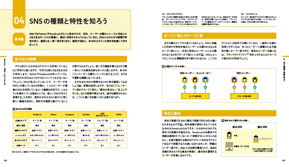 本書では、はじめてSNSによるマーケティング活動に携わる初心者のために、SNSマーケティングの基本とメリット、各SNSの特性と機能、広告の出稿方法、投稿の効果の見方などを網羅的に解説した入門書です。Facebook、Twitter、Instagramを中心に、LINE、YouTube、TikTok、Pinterest、Snapchatについても触れており、SNSマーケティングの全体像をひととおりつかむことができます。また、分析・改善の手法や成功事例など、運用面のノウハウやヒントも紹介しているため、指針をつくる際にも役立ちます。