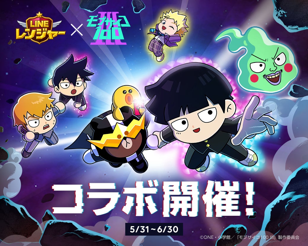 本コラボレーションでは、アニメ『モブサイコ100 Ⅲ』に登場するキャラクターの「影山茂夫」「霊幻新隆」「エクボ」「影山律」「花沢輝気」がコラボ限定のレンジャーとして登場するほか、コラボスペシャルステージ「モブサイコ100惑星」を開催します。