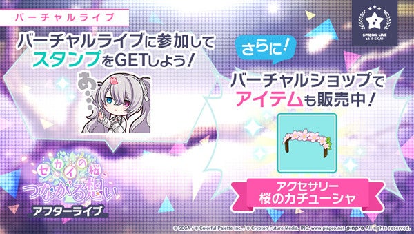 また、「セカイの桜、つながる想い アフターライブ」の開催に先立ち、3月30日(水)からバーチャルショップに、アクセサリ「桜のカチューシャ」を追加いたしました。