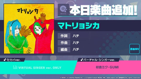 株式会社セガ(本社:東京都品川区、代表取締役社長COO:杉野行雄)と株式会社Colorful Palette(本社:東京都渋谷区、代表取締役社長:近藤裕一郎)は、iOS/Android向けリズム&アドベンチャー『プロジェクトセカイ カラフルステージ! feat. 初音ミク(以下、プロジェクトセカイ)』について、2022年3月30日(水)より、「1.5周年記念楽曲追加キャンペーン」として「マトリョシカ」(作詞・作曲:ハチ)をリズムゲーム楽曲として追加いたしました。