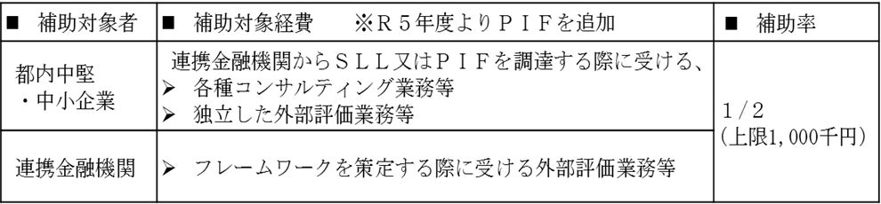 東京都では、令和4年度より、金融機関と連携して、サステナビリティ・リンク・ローン(SLL)の活用を通じて、中小企業等の経営をサステナビリティに配慮したものへと転換を促す事業に取り組んでいますが、この度、支援対象にポジティブインパクトファイナンス(PIF)を追加して今年度の事業を開始しますので、下記のとおりお知らせします。