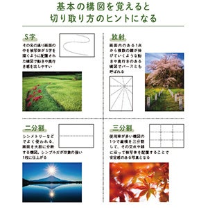 ●名所の撮り方をイラストと写真で分かりやすく解説! イラストによる図解と実際撮影された写真がセットになっているのでひとめで仕上がりイメージが確認できます。その他、おすすめの撮影時期や時間帯、必要なレンズや三脚の有無、アクセス方法なども紹介しています。