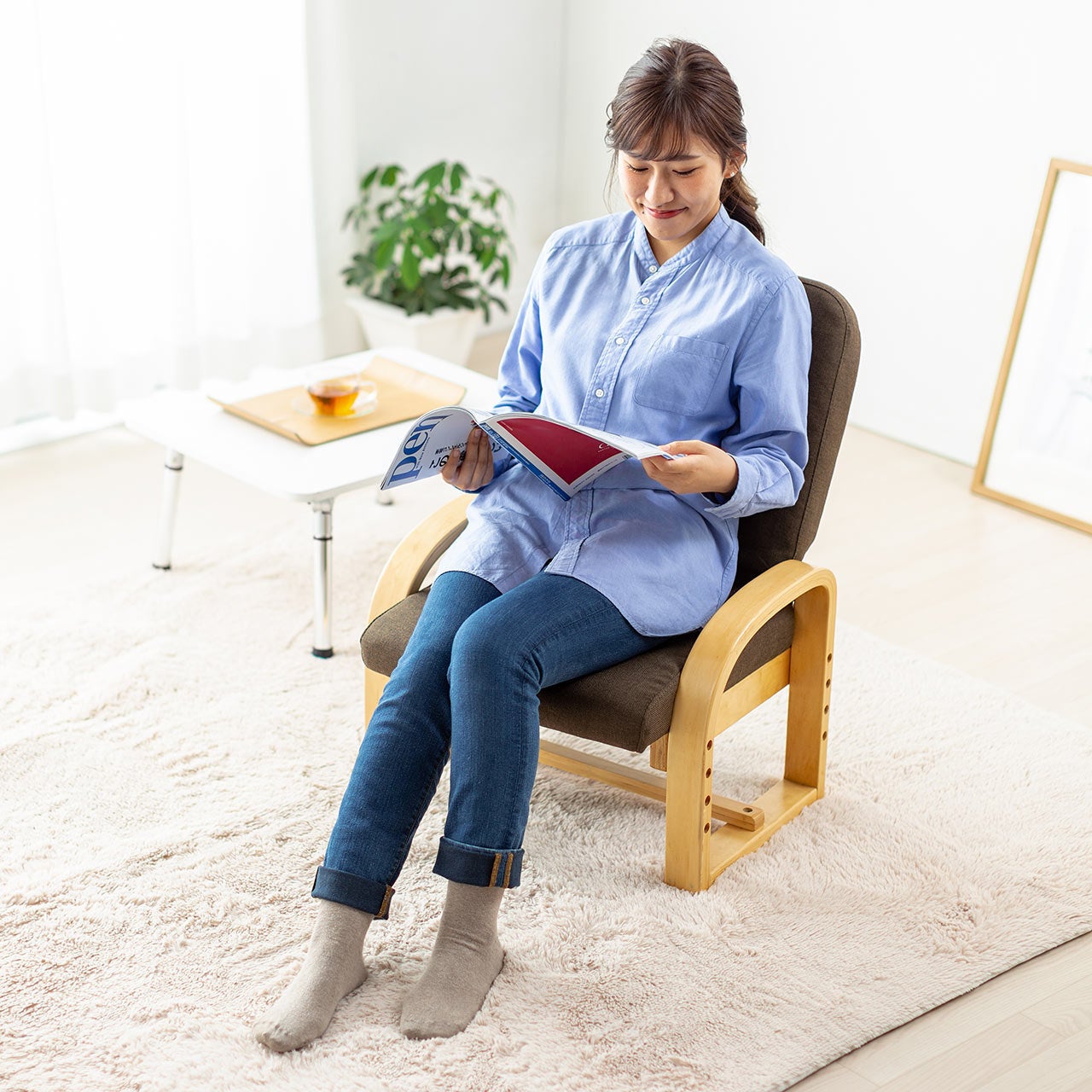 本製品はリビングなどで脚を伸ばしてリラックスできるコンパクトサイズの高座椅子。床から高さがあるので、立ち座り時に腰や膝への負担を軽減できる。背もたれ角度3段階、座面高さ3段階調整可能。テレビのリモコンやメガネなどを収納できる小物収納ポケット付き。