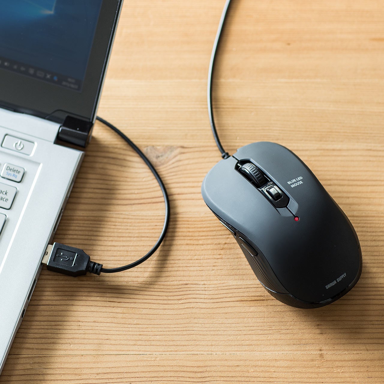 マウスのサイドには戻る・進むボタンを搭載。電池切れの心配のない有線タイプ。