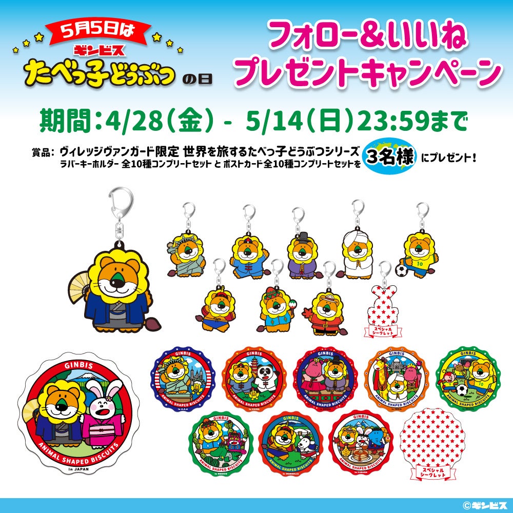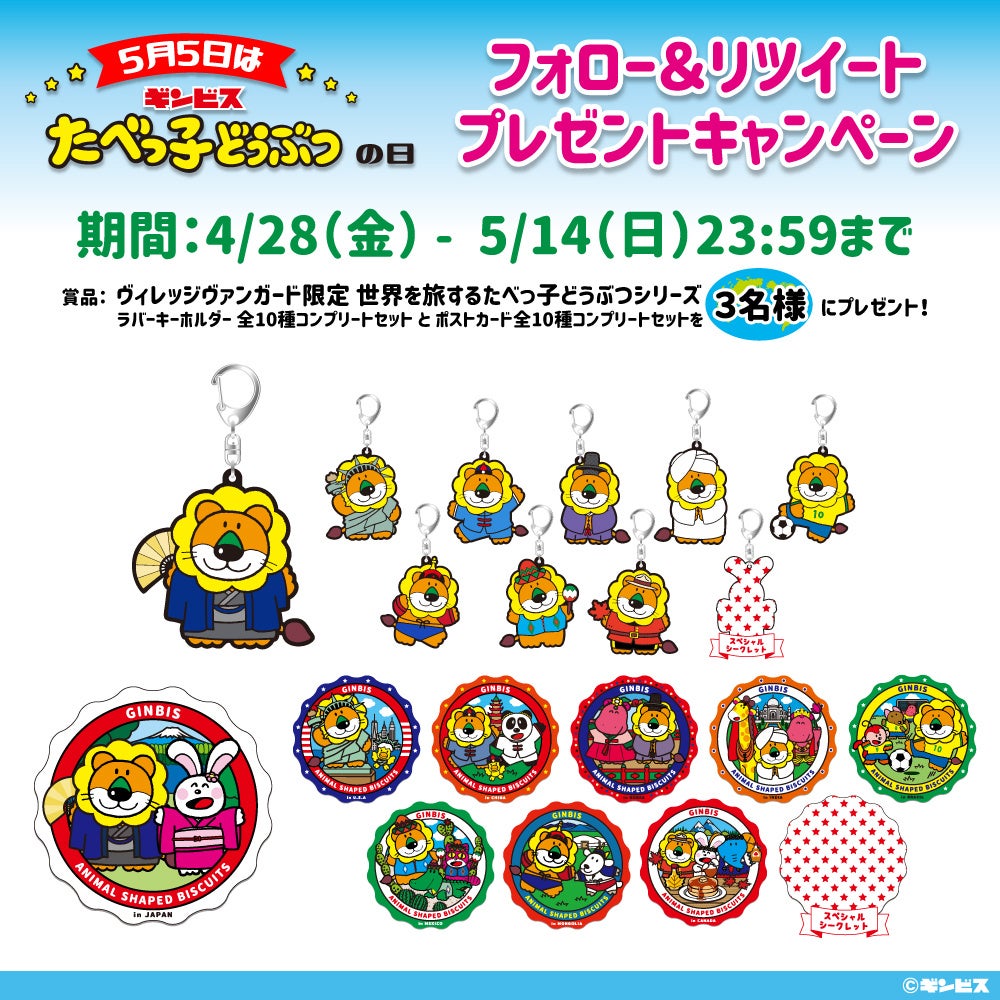 来たる5月5日のたべっ子どうぶつの日を記念して、ヴィレッジヴァンガード限定たべっ子どうぶつグッズが当たるSNSプレゼントキャンペーンを、TwitterとInstagramにて実施いたします。Twitterで3名様、Instagramで3名様、合計6名様に、『世界を旅するたべっ子どうぶつ』シリーズのグッズのコンプリートセットをプレゼントいたします。