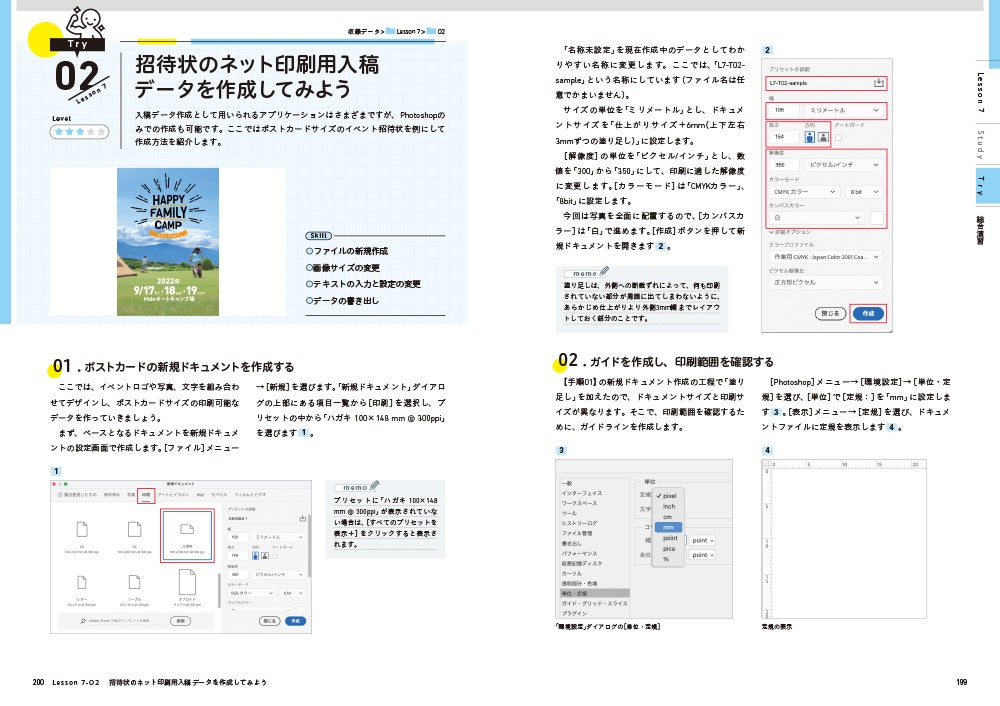 作例は写真の補正、切り抜き、合成、文字入れなどのよく使うテクニックから、実際にバナーやカードのデザインを完成させるところまで、Photoshopの使い方をしっかり学べます。プロの講師によるわかりやすい解説で、ぐんぐん上達します。