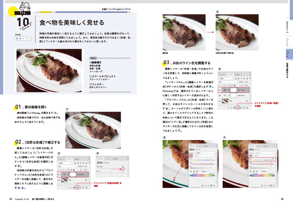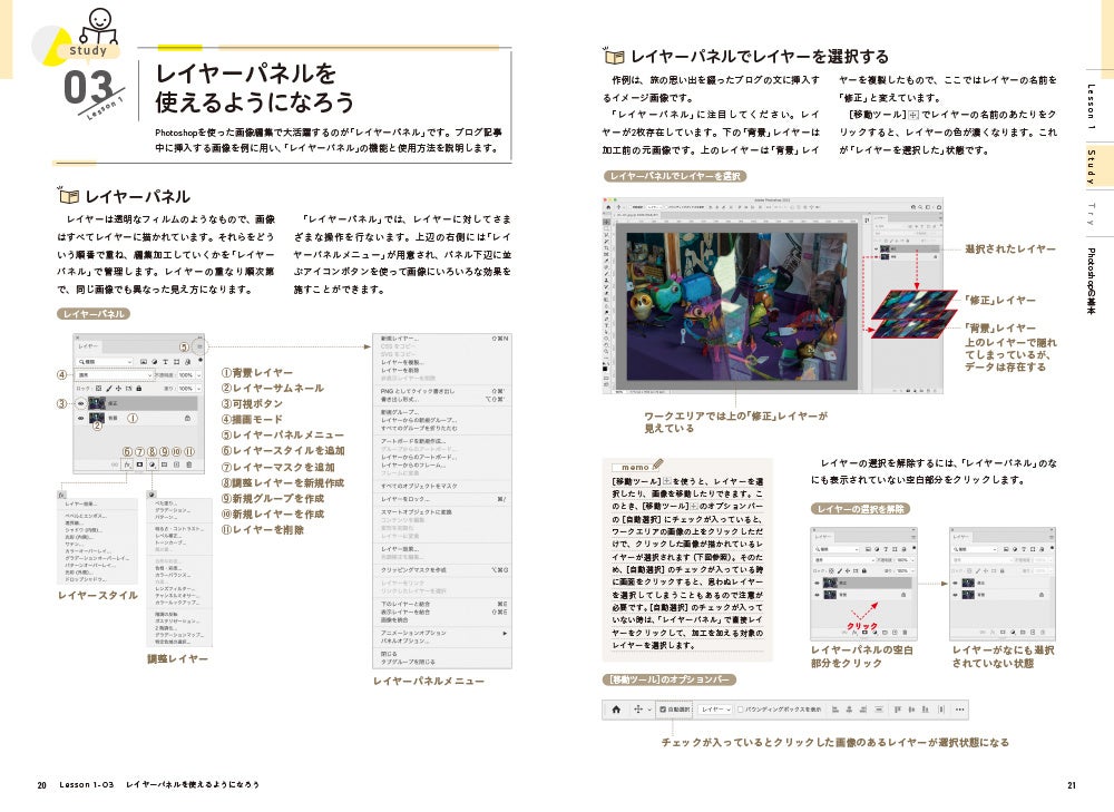 本書は章ごとに、「基本知識を学ぶ Study → 作例をつくってみる Try」の構成になっており、操作の基本をしっかり理解したうえでPhotoshopを使えるようになります。