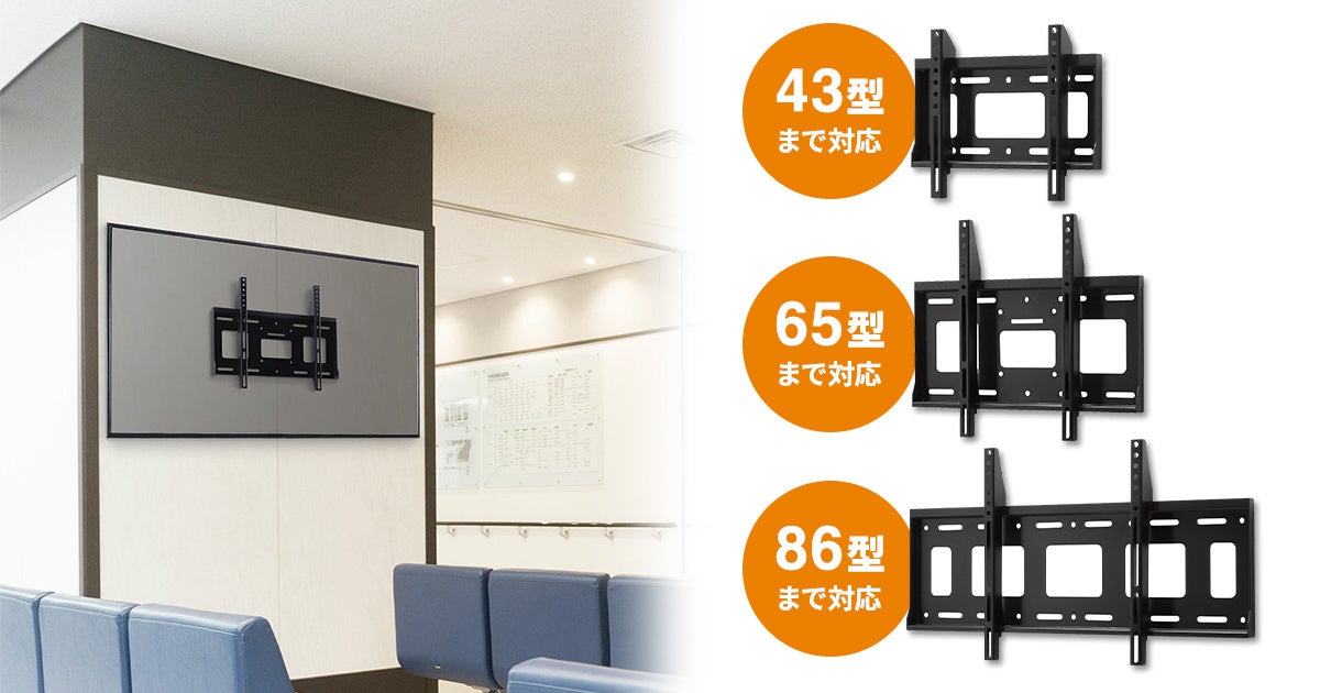 「CR-PLKG17BK」は43型まで、VESA規格は100×100〜300×200に対応、「CR-PLKG18BK」は65型まで、VESA規格は100×100〜400×400に対応、「CR-PLKG19BK」は86型まで、VESA規格は100×100~600×400に対応しています。