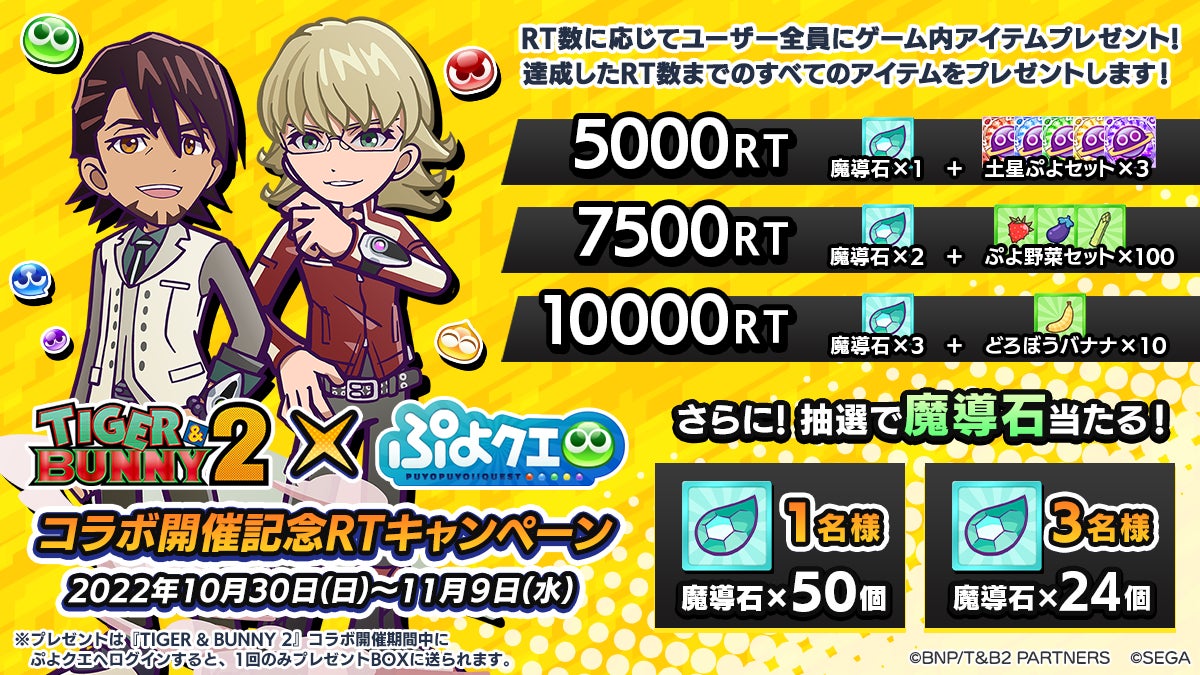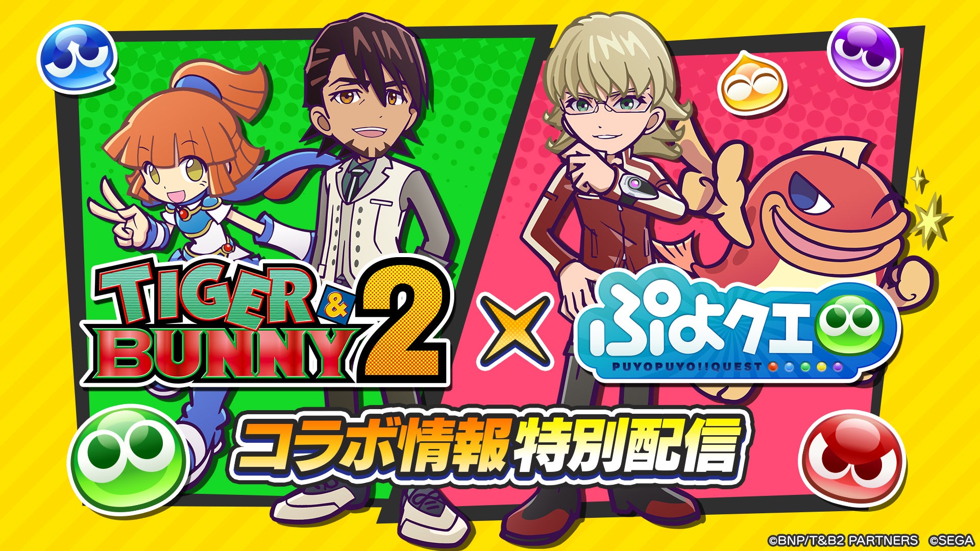 株式会社セガは、大好評配信中のパズルRPG『ぷよぷよ!!クエスト』(以下、『ぷよクエ』)において、アニメ『TIGER & BUNNY 2』とのコラボイベント開催が決定したことをお知らせします。また、2022年11月5日(土)20時より「TIGER & BUNNY 2 ×ぷよクエコラボ情報特別配信」を生放送でお届けします。コラボイベントの詳細を発表予定ですので、どうぞお楽しみに!