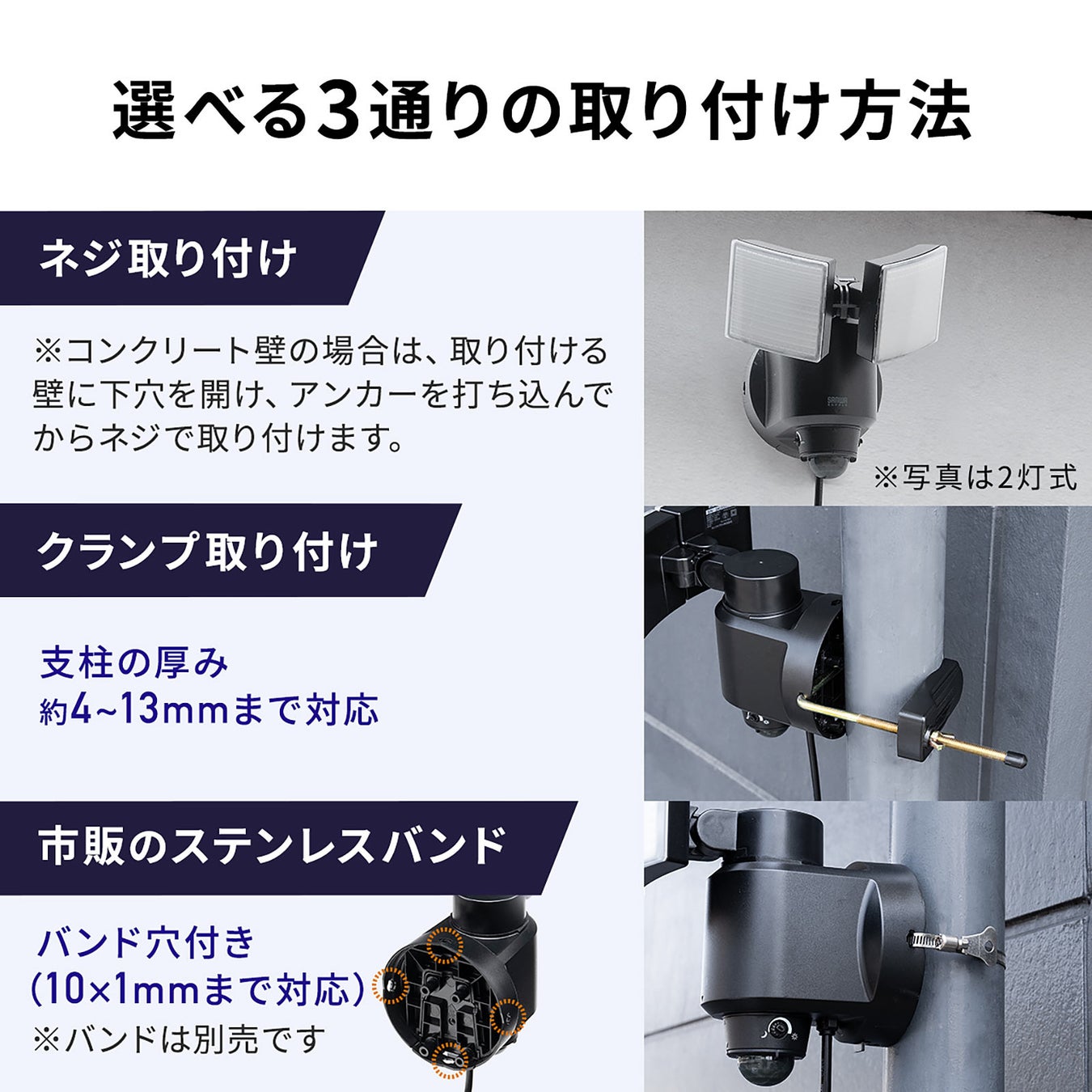 防水規格IP65に対応しており、屋外で雨に濡れる場所でも安心して使用可能です。様々な取り付け方法にも対応しており、クランプ固定やネジ、バンド(別売)での設置が可能です。