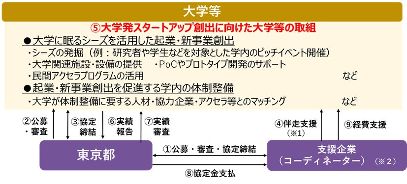 東京都とコーディネーター(株式会社キャンパスクリエイト)が連携し、大学発スタートアップの創出に向けた大学等の各種取組(シーズの事業化や学内の体制整備等)に対して、伴走支援及び経費支援を行います。
