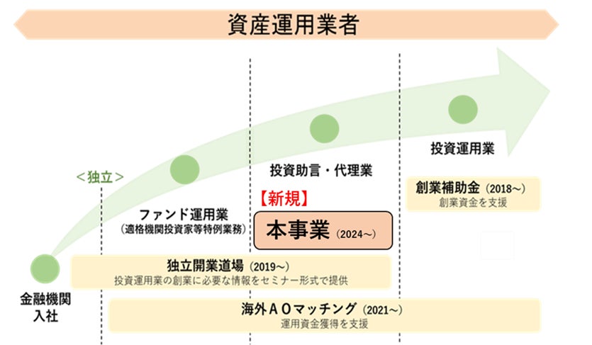 投資運用業を営むために必要なライセンスの取得には、高い人的・財務的要件等が求められます。投資助言・代理業等で投資運用経験を積み、投資運用業にステップアップしていく例もあることから、本事業を通じて、投資運用業者の裾野を拡大して参ります。
