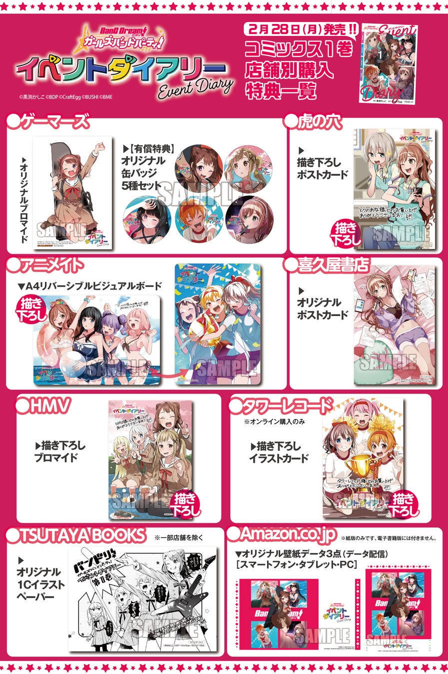 株式会社ブシロード(本社:東京都中野区、代表取締役社⻑:橋本義賢、以下ブシロード)のグループ会社にあたる株式会社ブシロードメディア(本社:東京都中野区、代表取締役社長:成田耕祐)は、スマートフォン向けゲーム「バンドリ! ガールズバンドパーティ!」のイベントストーリーをコミカライズした「バンドリ!ガールズバンドパーティ! イベントダイアリー」の単行本1巻が、本日2月28日(月)に発売することをご案内致します。本作品は無料で読めるWEB漫画サイト「コミックブシロードWEB」にて好評連載中です。皆様におかれましては是非誌面・Web記事等で本内容をお取り扱いいただければ幸いに存じます。