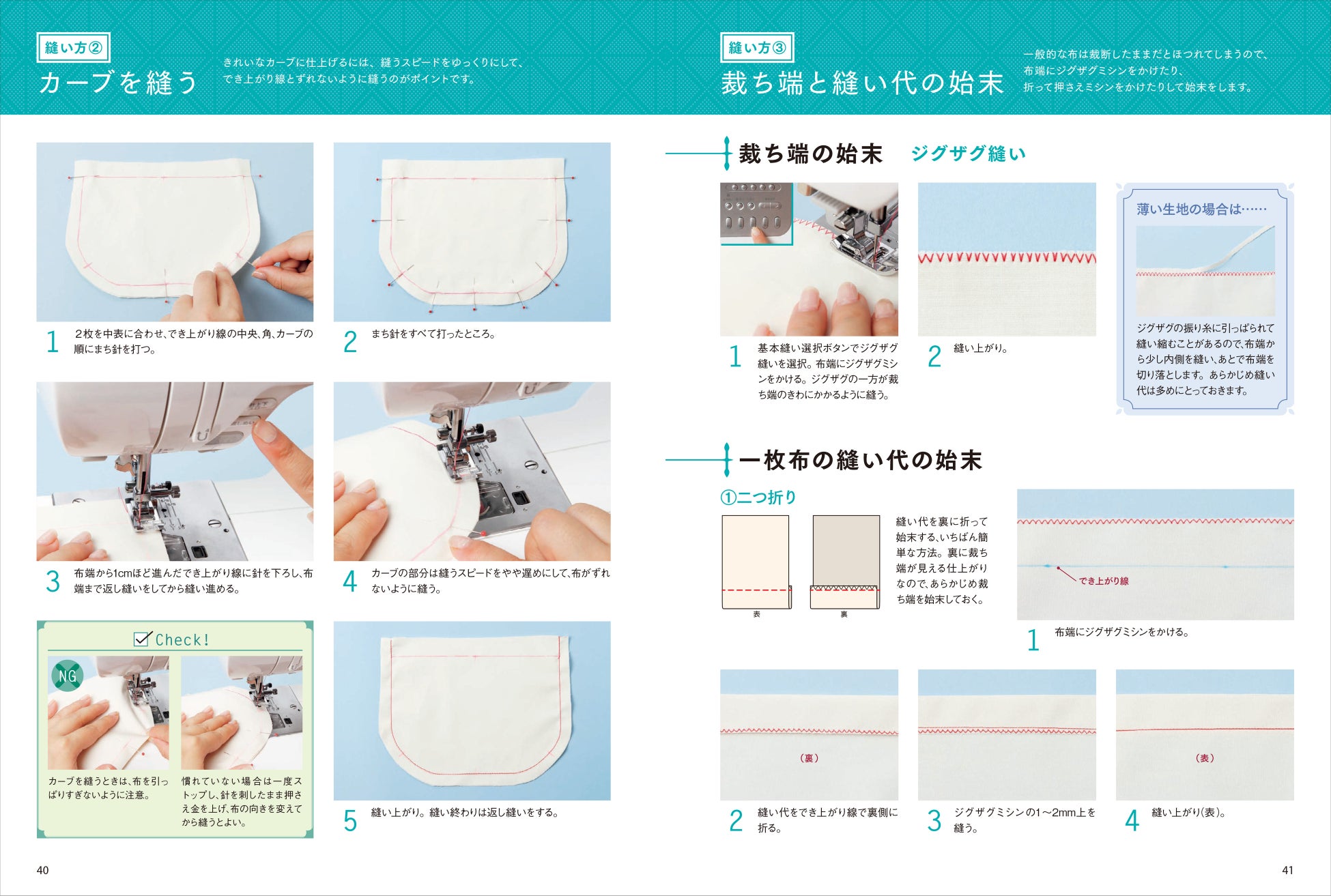 ミシンが初めての方はもちろん、ミシンの使い方に不安がある方にも最適。基本の縫い方から、ひもの通し口やファスナーのつけ方、袋物のまち作りなど応用テクまで充実。小物やスカートも学びながらきれいに作れます。