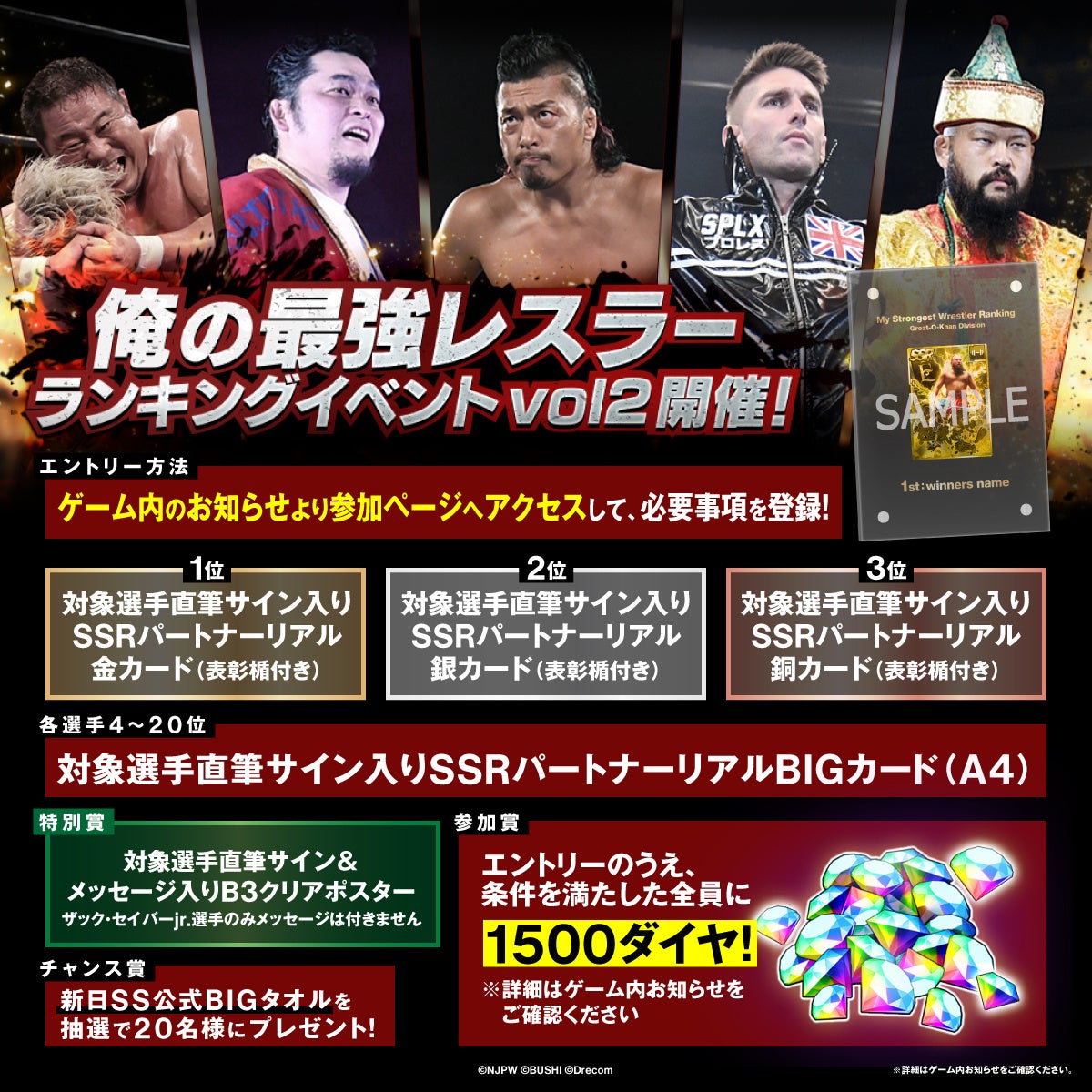 ※ランキングイベント終了後に、新日SS公式Twitterアカウント(@njpwss)からのDMでご連絡ができない場合賞品を贈ることが出来ないため予めご了承ください
