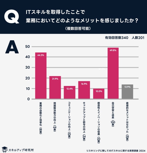 ITスキルの習得によるメリットとして、最も多かった回答は「自己学習と成長」で49.8%を占めた。次いで「業務の自動化と効率化」が44.3%と高い割合となった。業務プロセスの改善や日々の作業効率が上がるなど、実務面でのメリットを実感している人が多数いることがわかる。