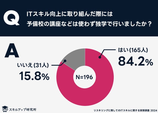 ITスキル向上の取り組み方について、調査対象者の84.2%が「ITスキルの向上に際して独学で取り組んだ」と回答した。ITスキルのリスキリングにおいて、独学が圧倒的に主流となっていることがわかる。