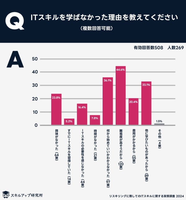 ITスキルを学ばなかった理由として、最も多かったのが「難易度が高そうだから」で44.6%を占めた。ITリテラシーを身につけることへの心理的ハードルが非常に高いことが窺える。また、「何から始めていいかわからなかった」も36.1%と多く、ITスキル習得の入り口が分かりにくいことも障壁になっているようだ。